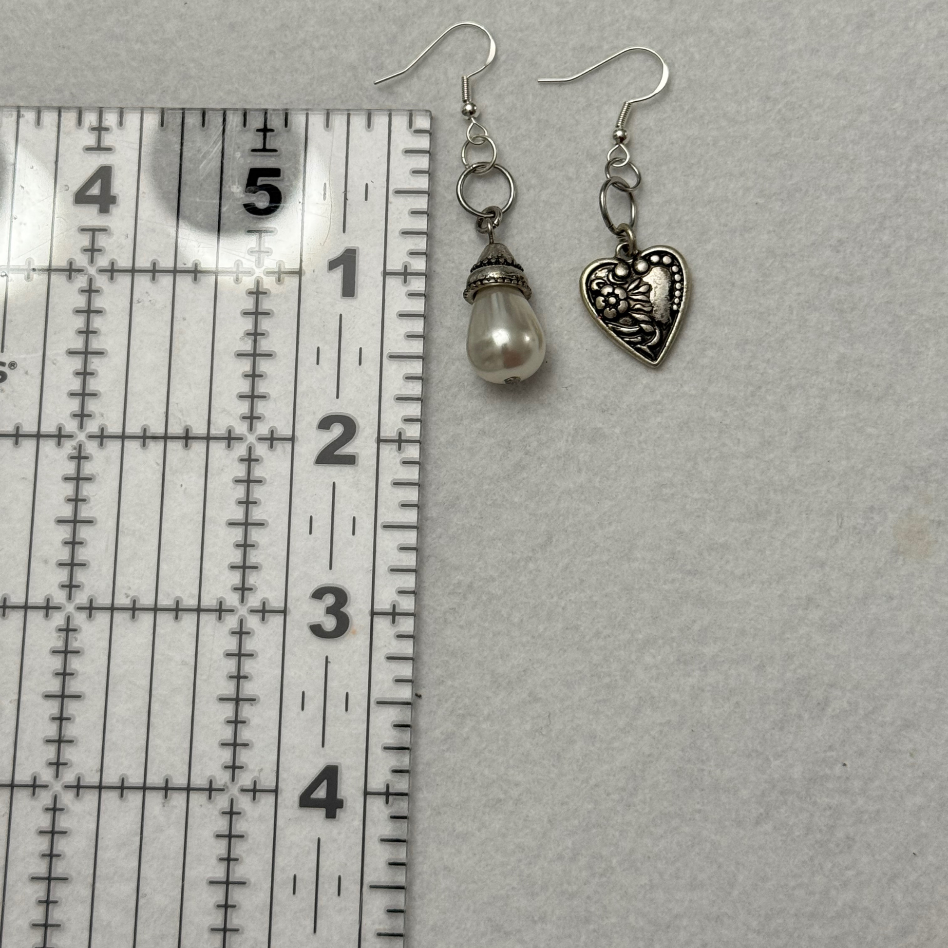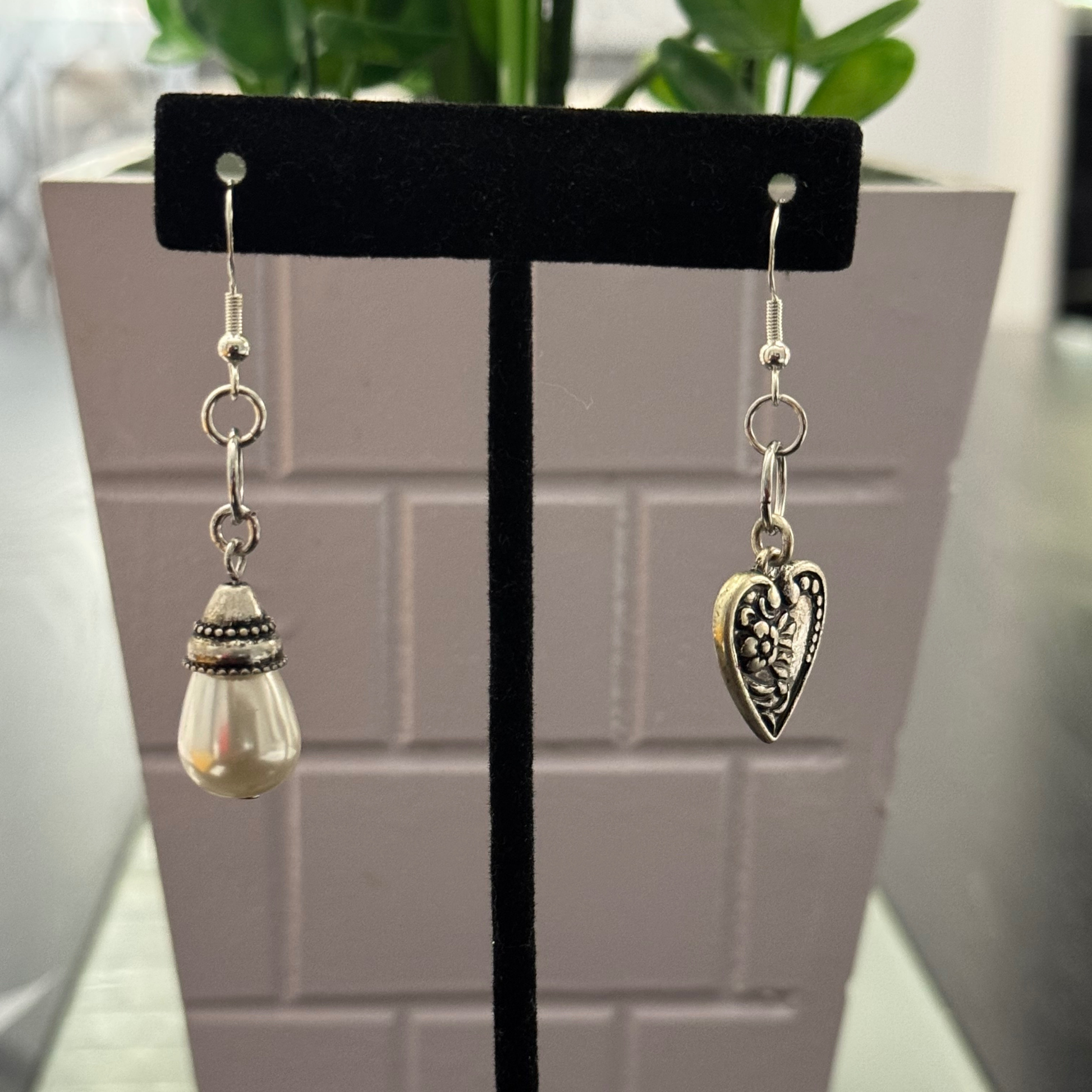 Includes 2 pairs of earrings: Pearl-style teardrop dangles with vintage silver caps + Etched silver-tone floral heart charms