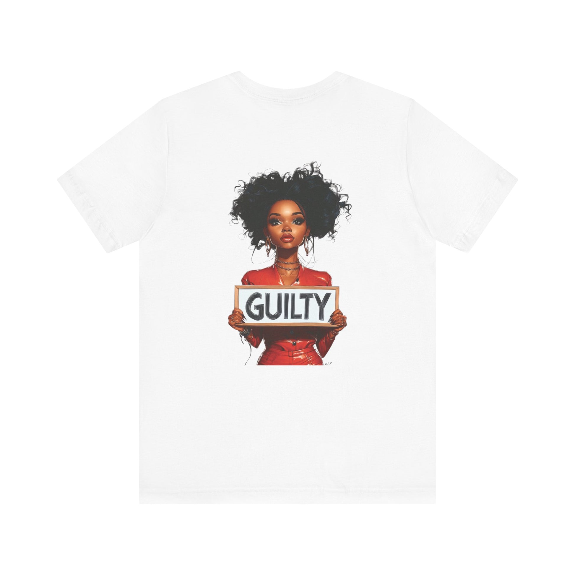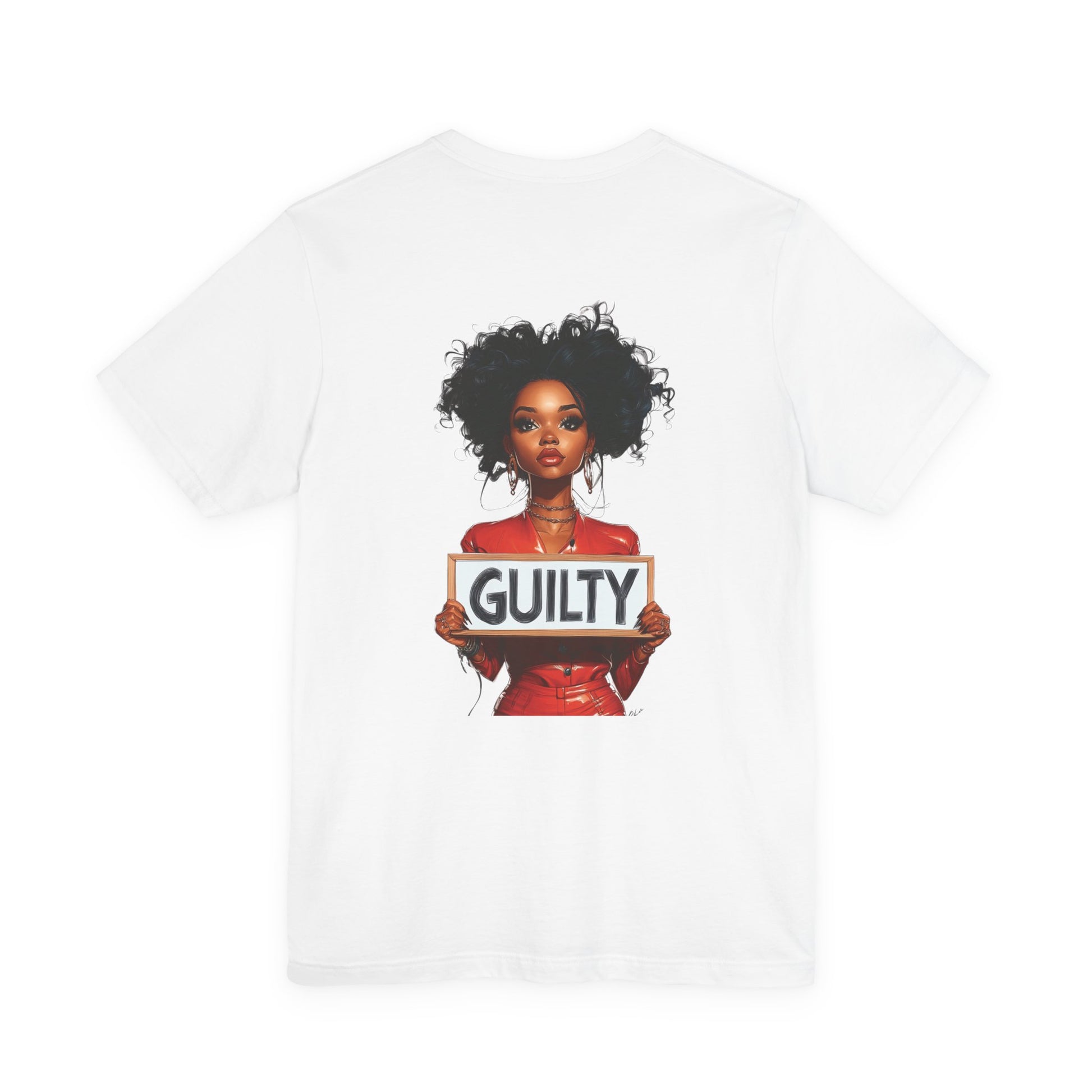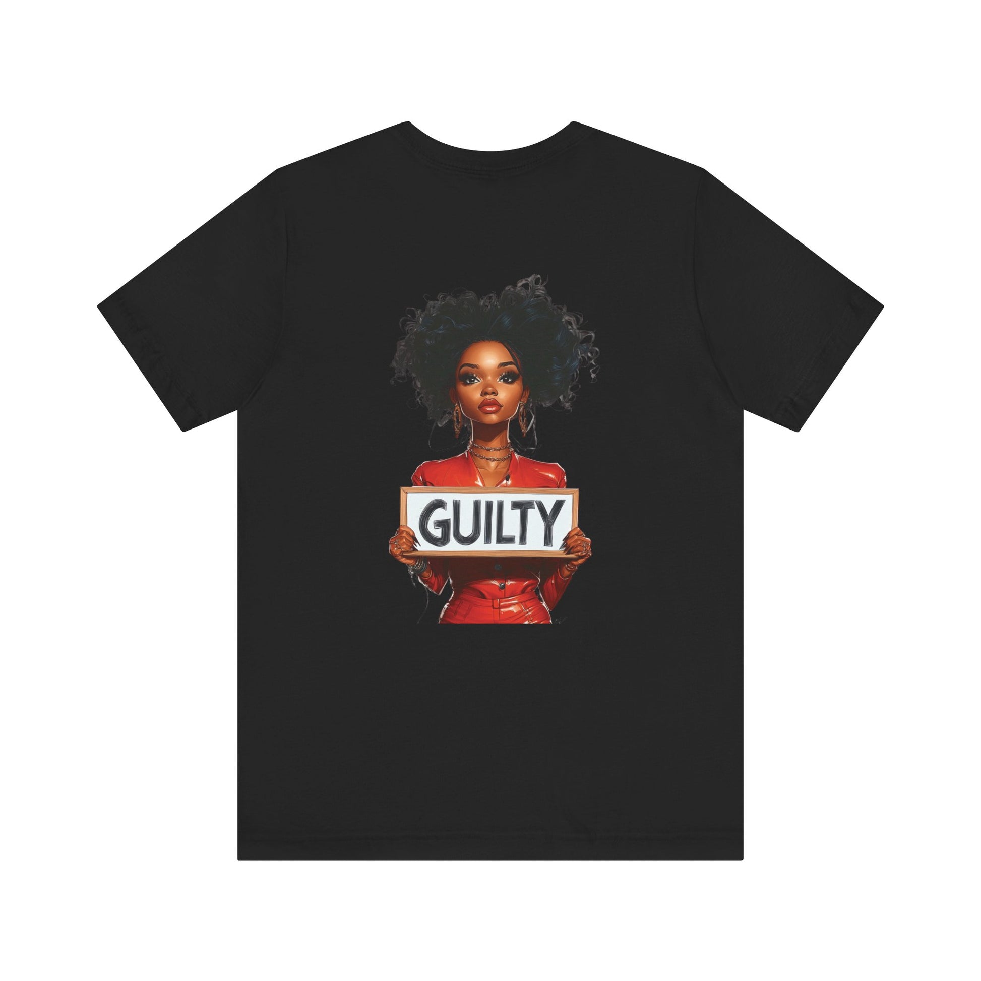 Celebrate the resilience and empowerment of Black women with this bold tee featuring an African-American woman holding a sign that reads 'GUILTY.' This design symbolizes overcoming self-sabotage and self-destructive behaviors, highlighting a journey of healing and growth.