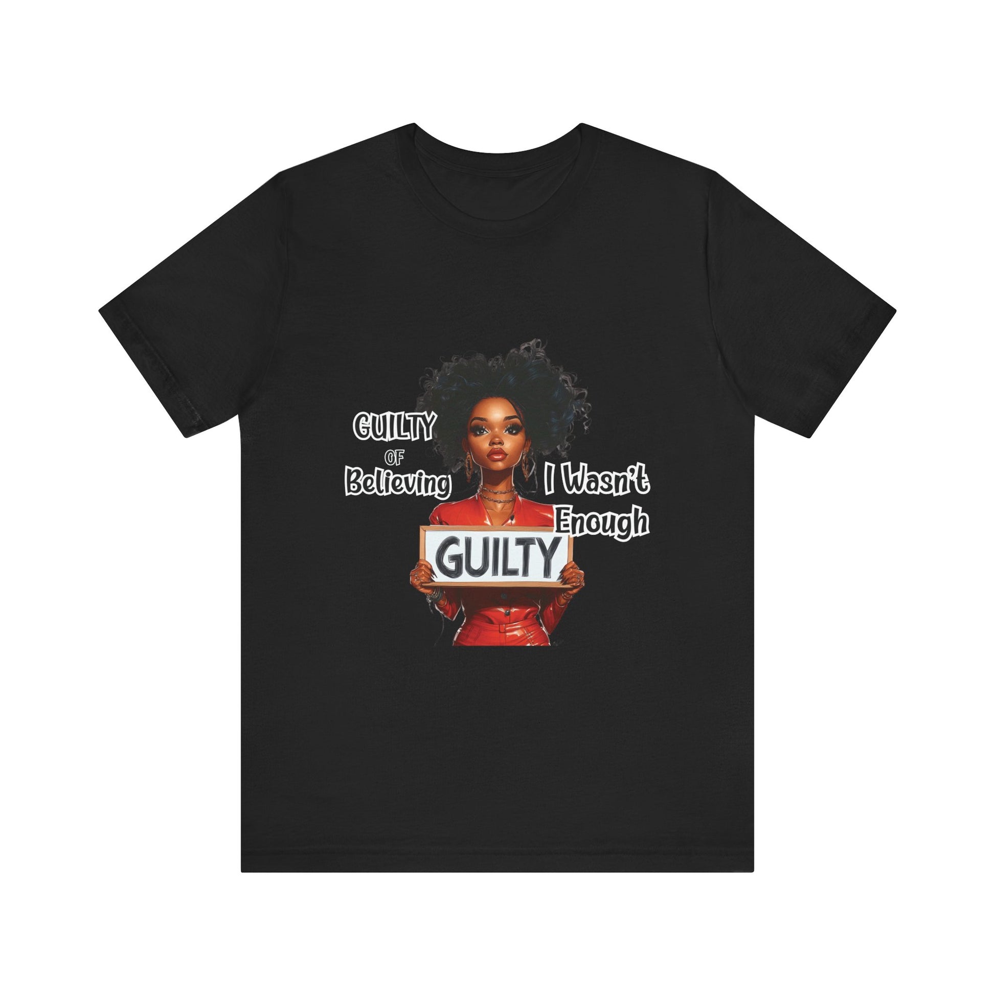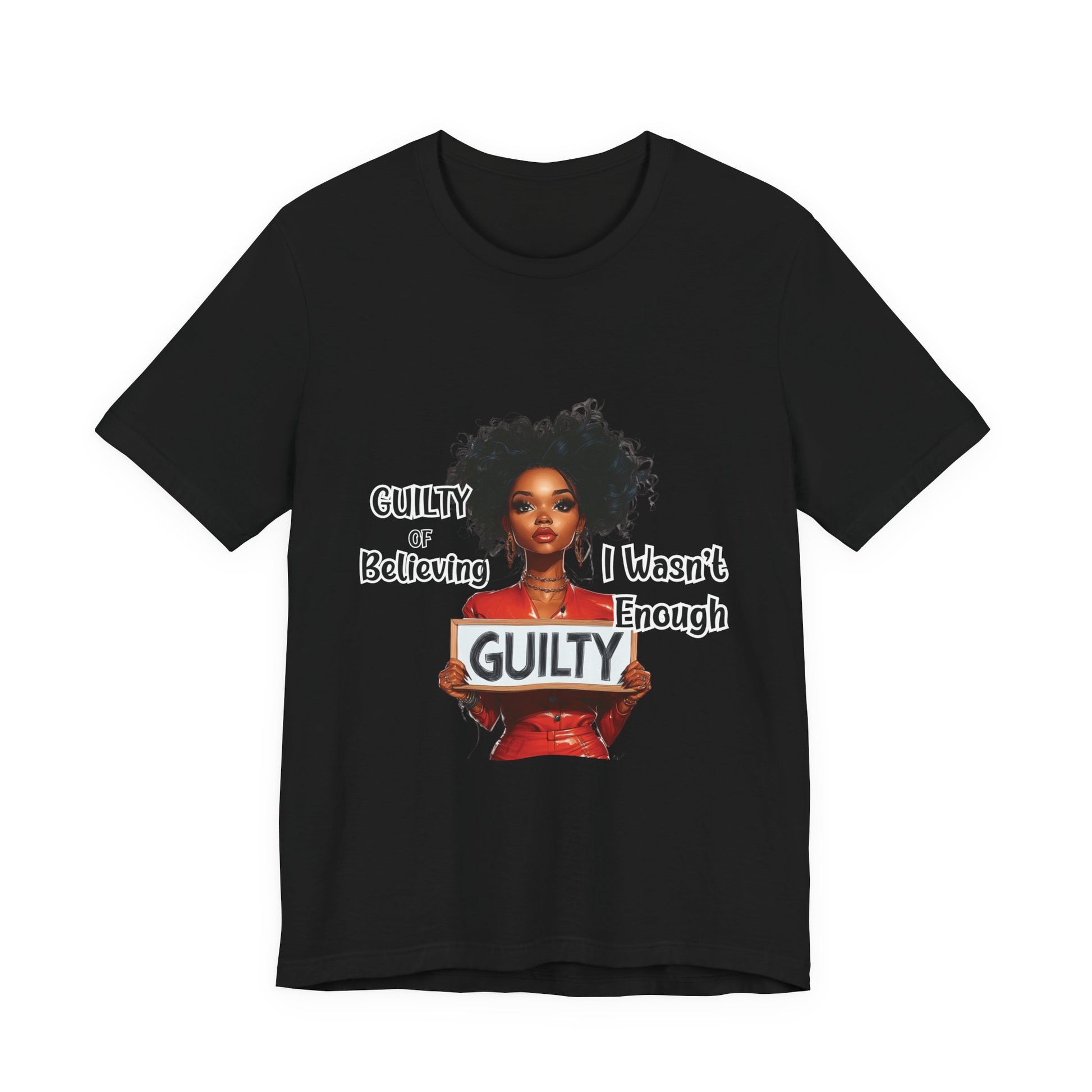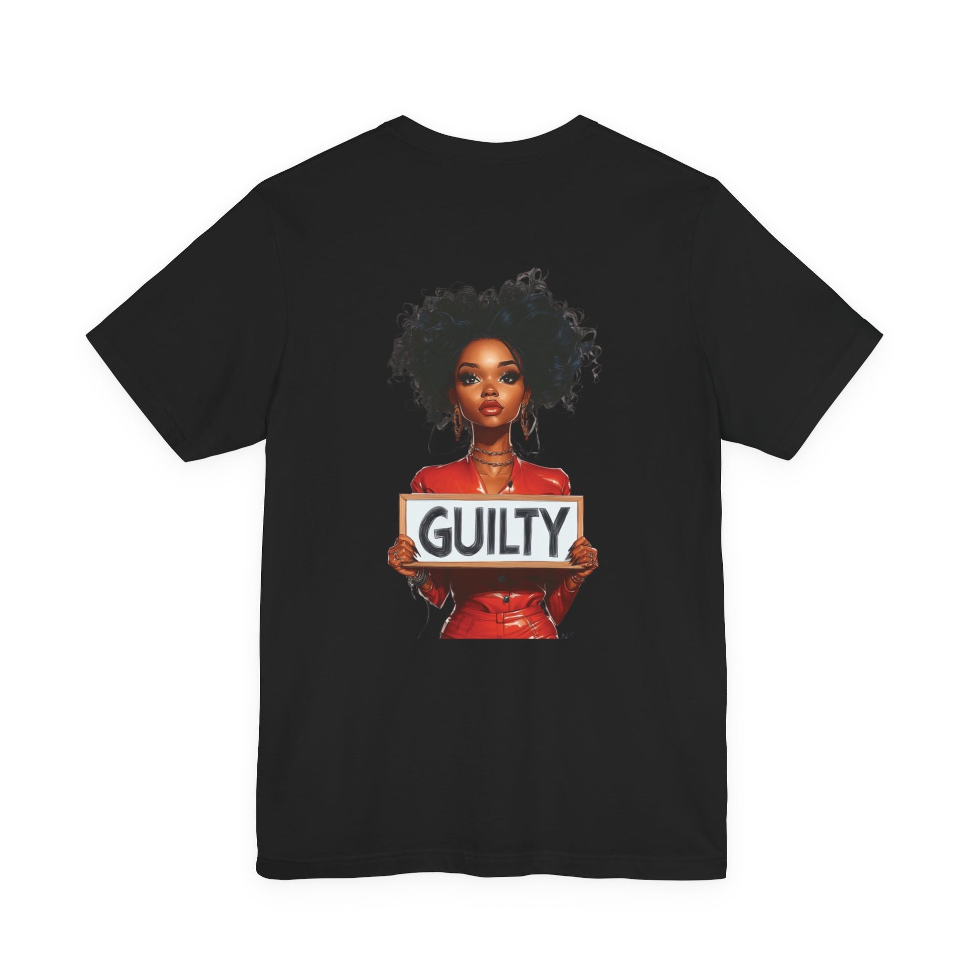 Celebrate the resilience and empowerment of Black women with this bold tee featuring an African-American woman holding a sign that reads 'GUILTY.' This design symbolizes overcoming self-sabotage and self-destructive behaviors, highlighting a journey of healing and growth.